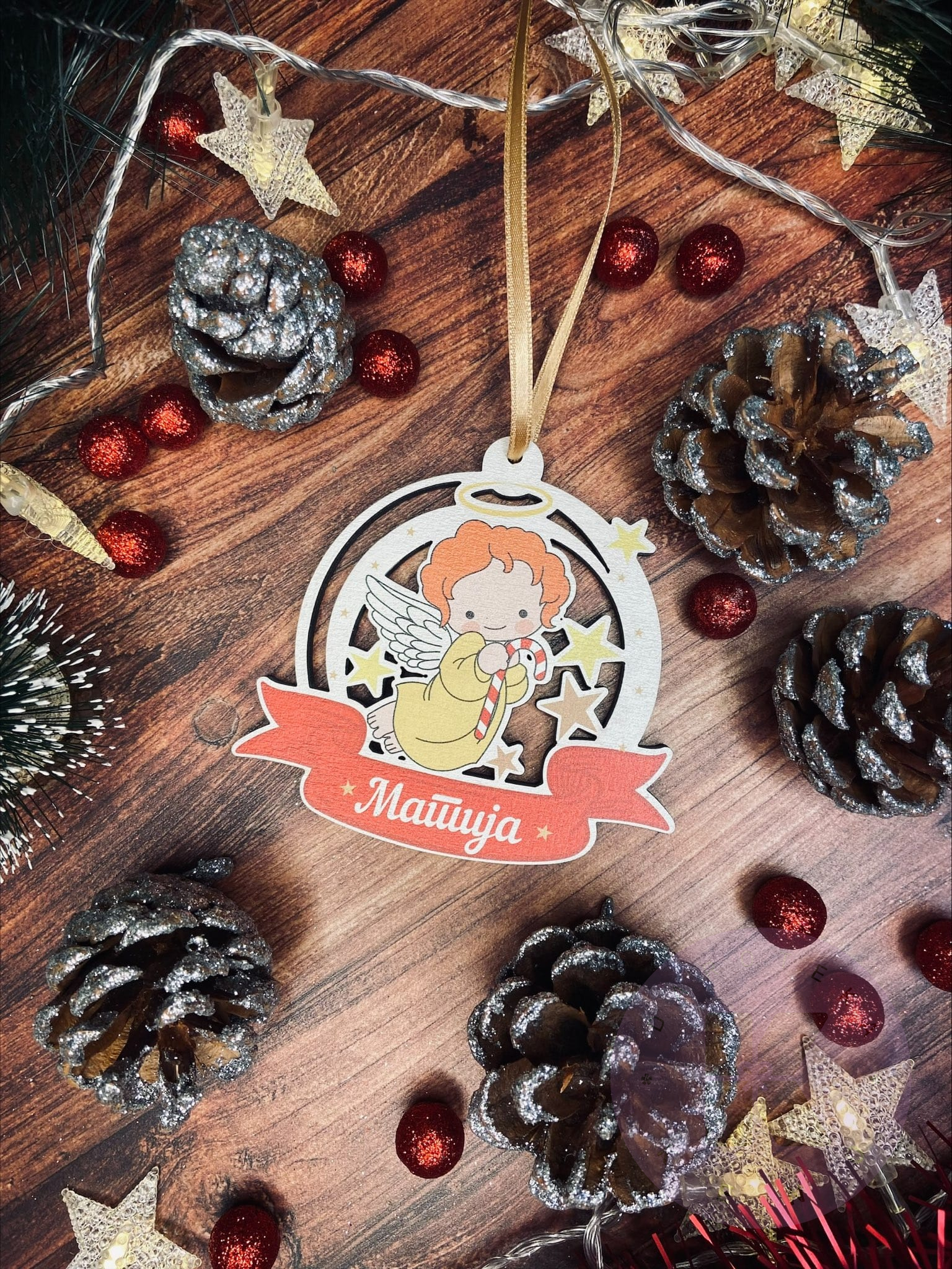 Ukras napravljen od drveta sa štampom, za jedno ime po želji. Dimenzije su 10x10cm.