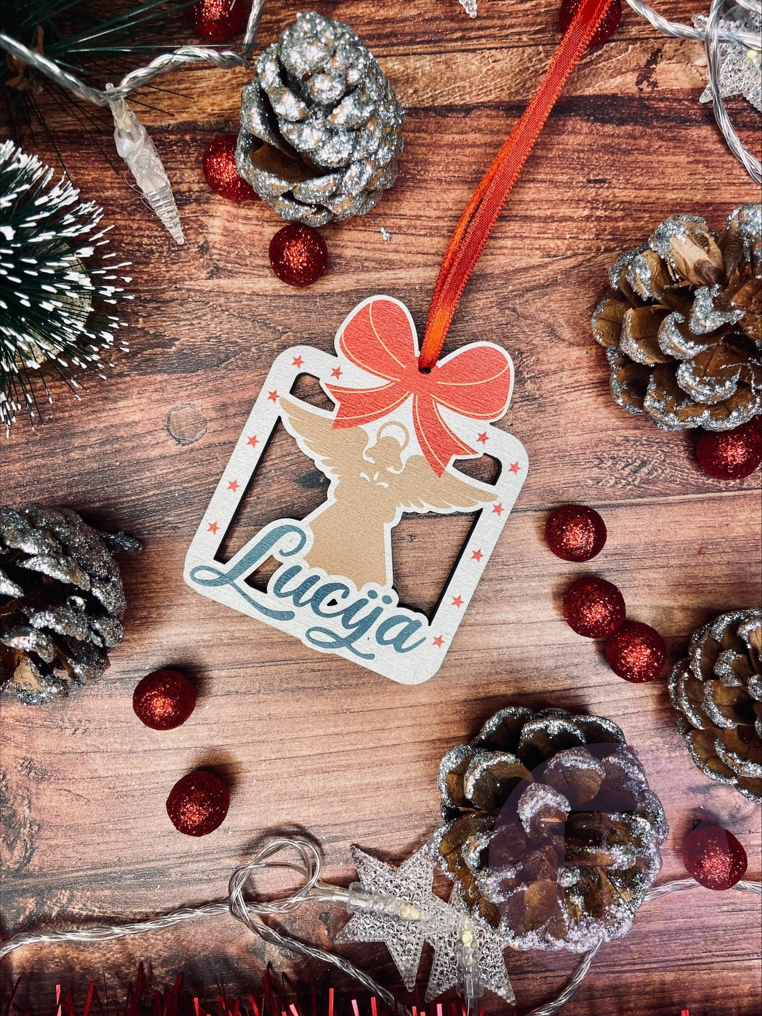 Ukras napravljen od drveta sa štampom, za jedno ime po želji. Dimenzije su 7x9cm.