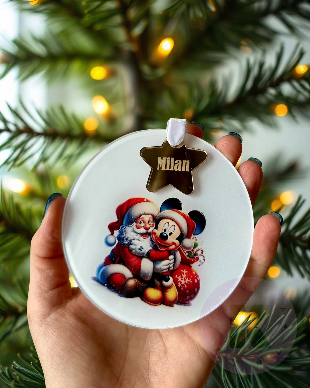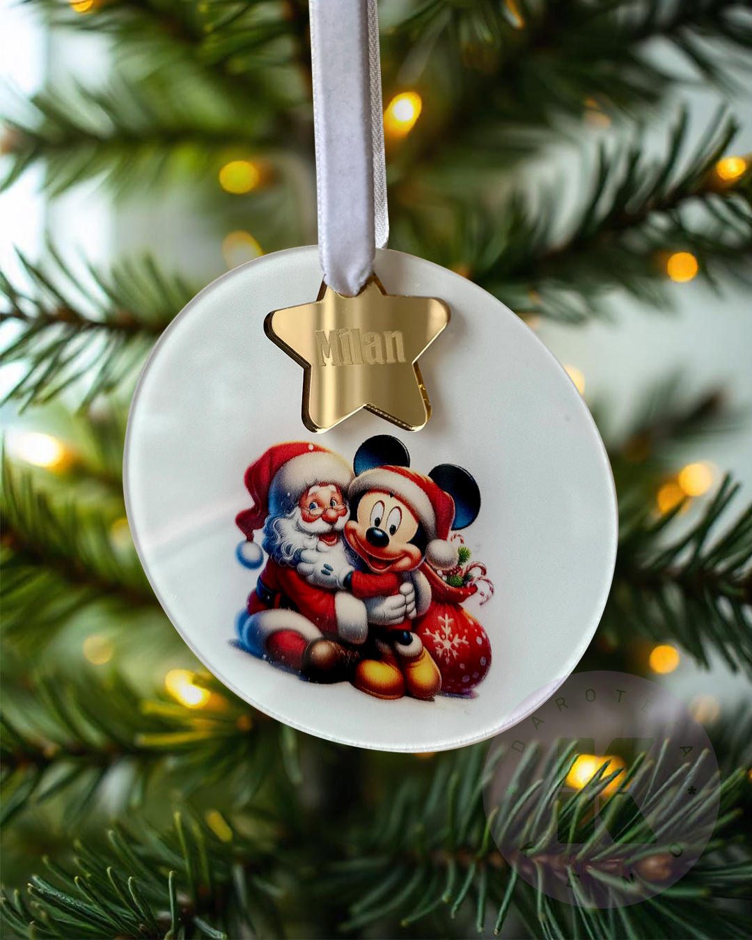 Ime je po želji. Napravljen je od klirita sa štampom, dok je deo sa imenom od zlatnim klirita sa gravurom.