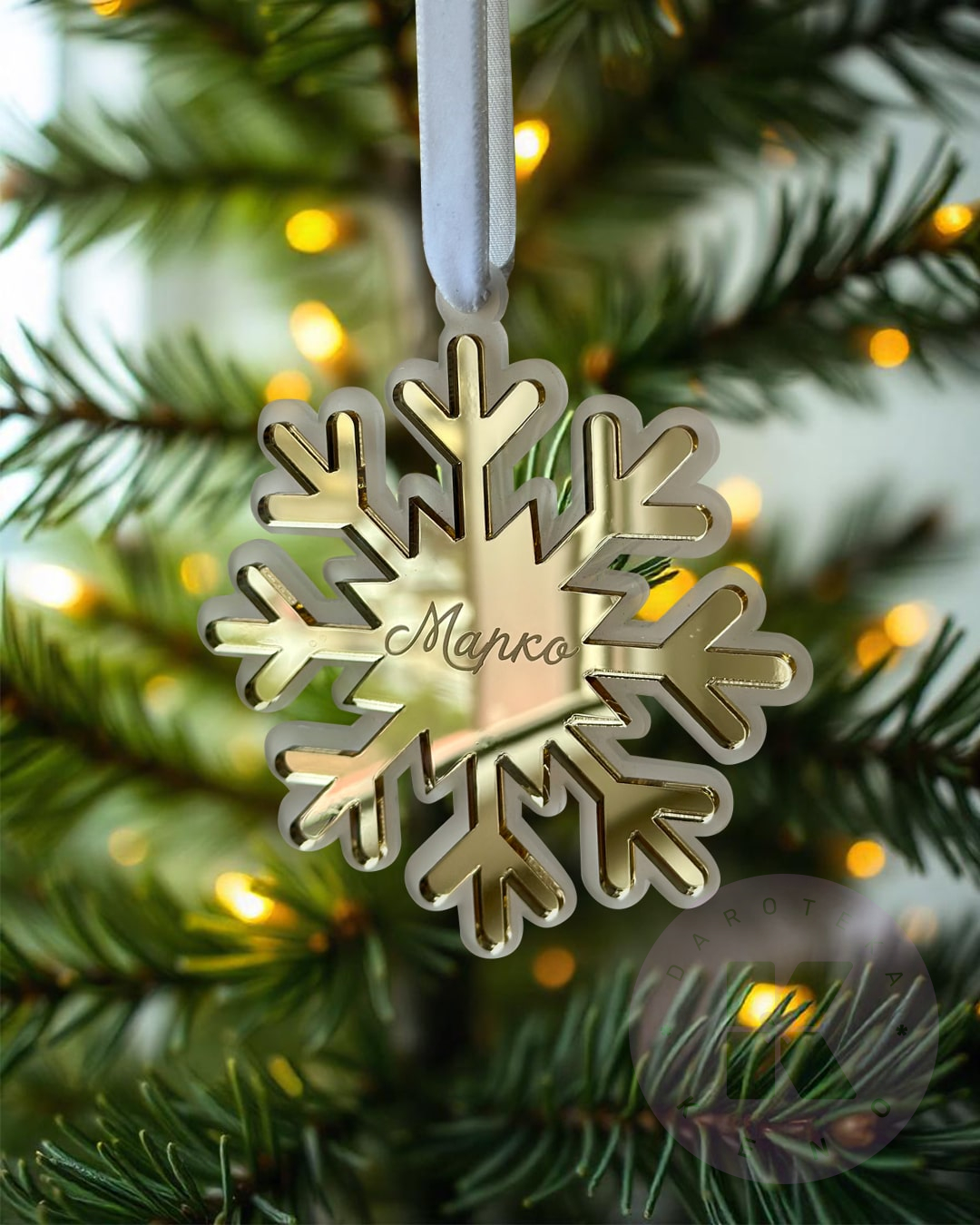Ime je po želji. Napravljen je od peskirnog klirita, dok je gornji od zlatnog ogledala klirita sa gravurom.