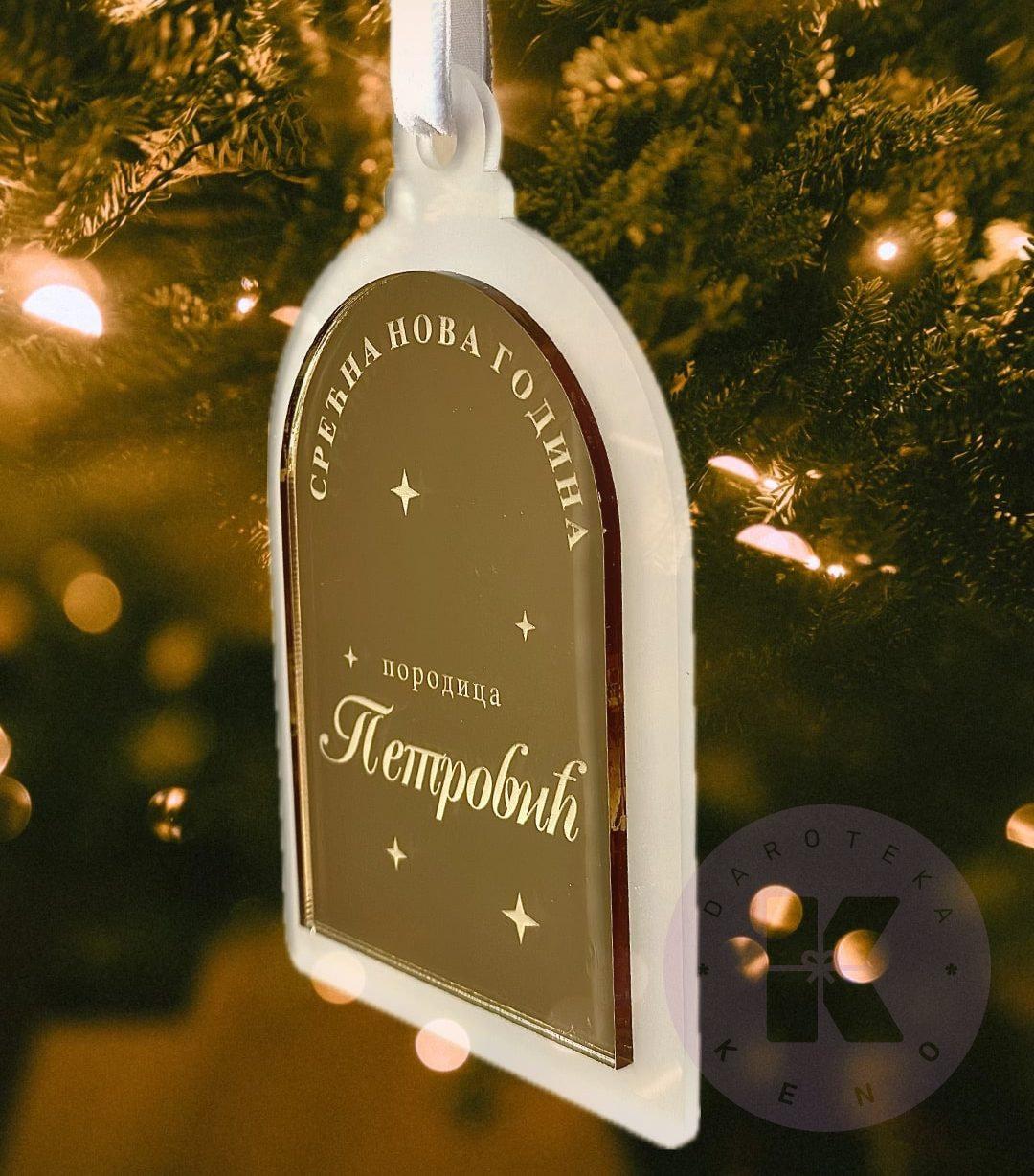 Prezime je po želji. Napravljen je od peskirno belog klirita, dok je deo sa prezimenom od zlatnog ogledala klirita sa gravurom.