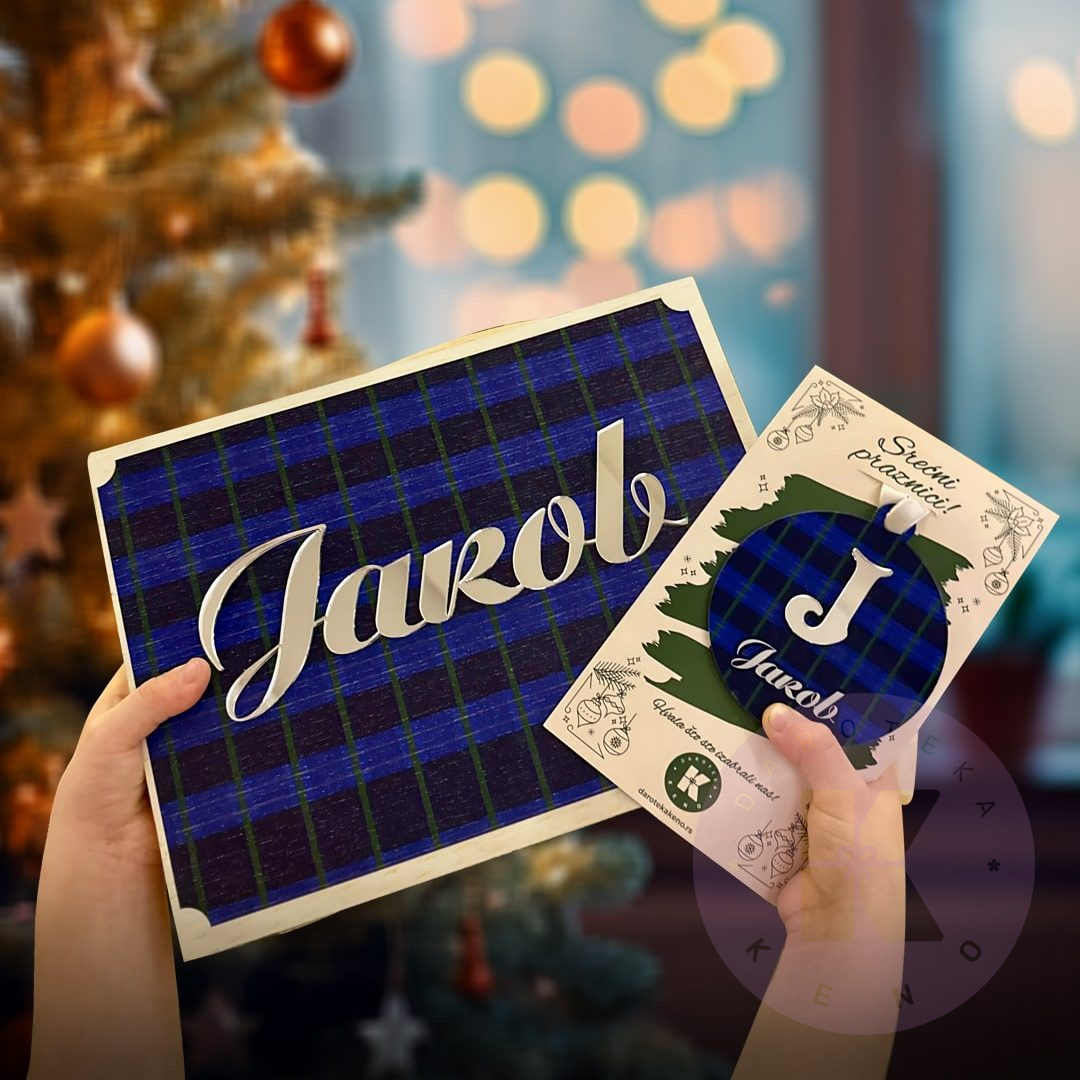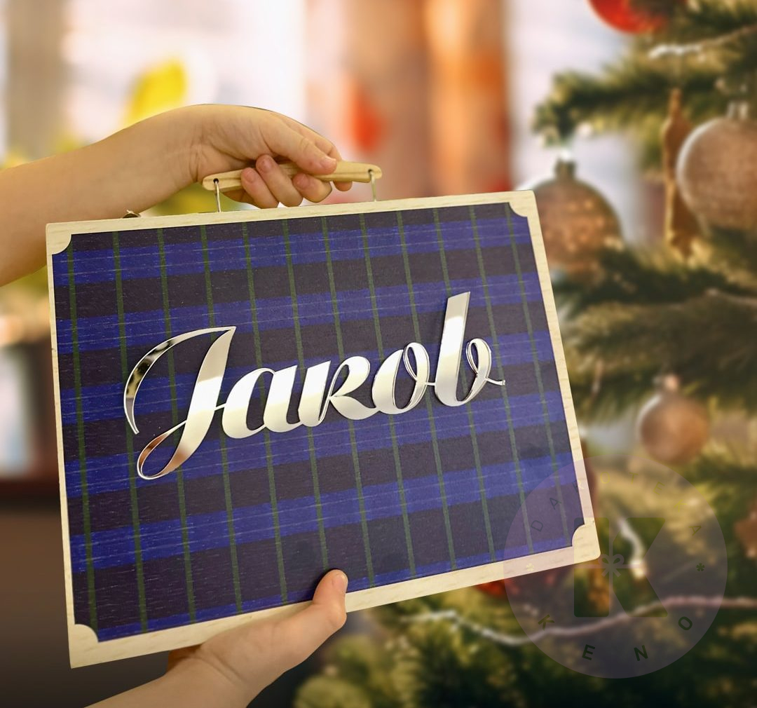 Ukras je sa imenom po želji. Napravljen je od  providnog klirita sa štampom, dok je slovo od srebrnog ogledala klirita.
