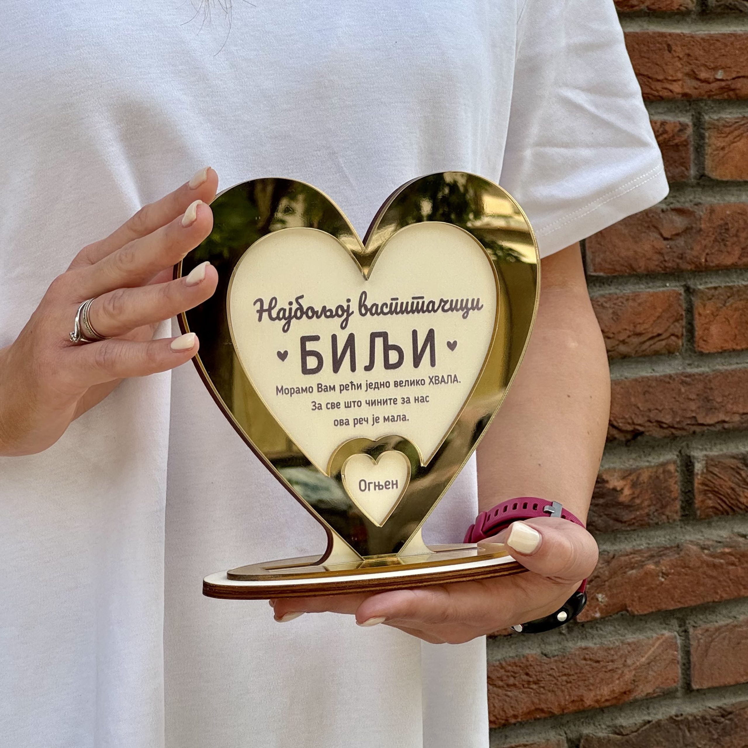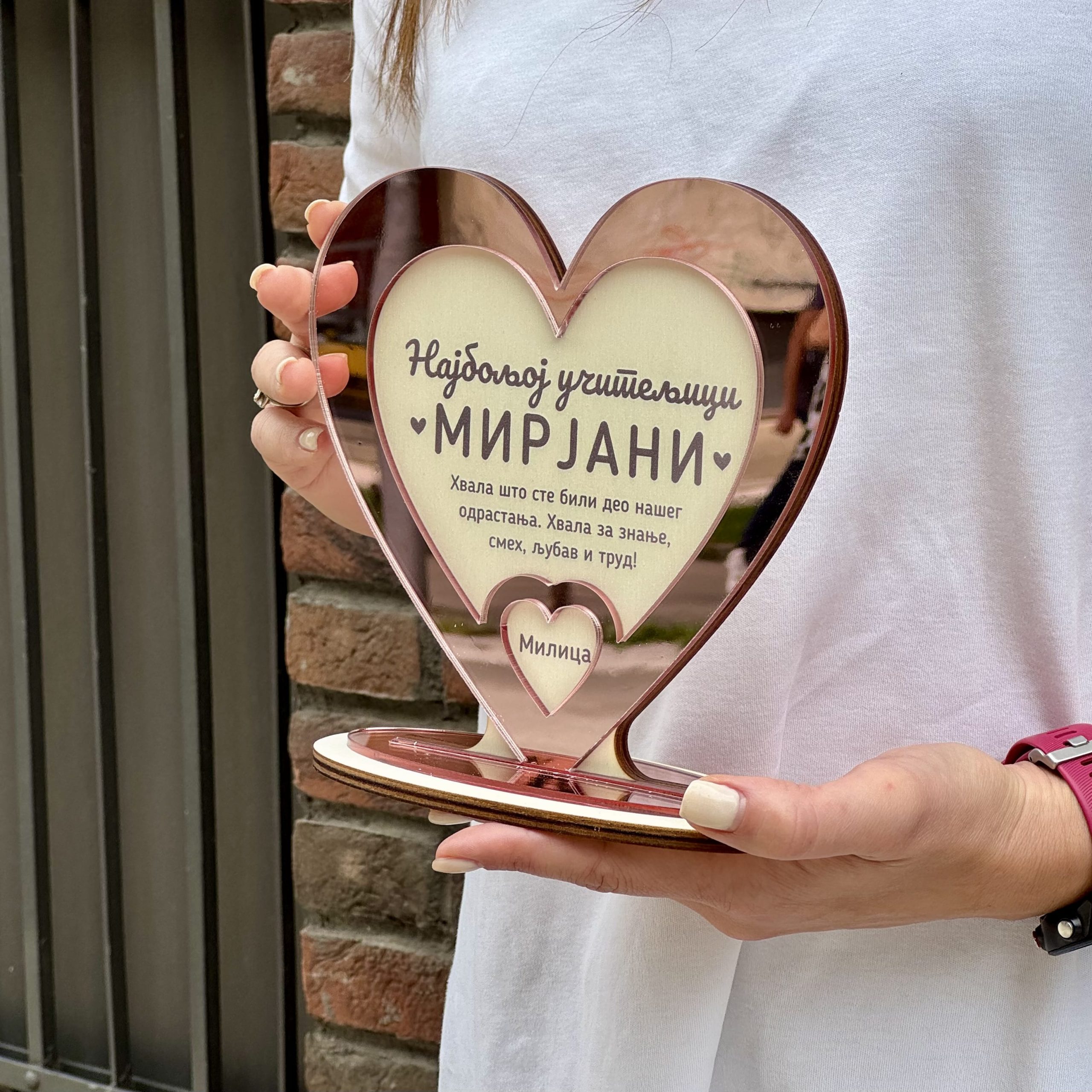 Stalak srce koje može biti za sve drage osobe: mame, tate, bake, deke, kume, vaspitače, učiteljice… Visina  je 18cm, u kombinaciji drveta i zlatnog, rose gold i srebrnog ogledala.