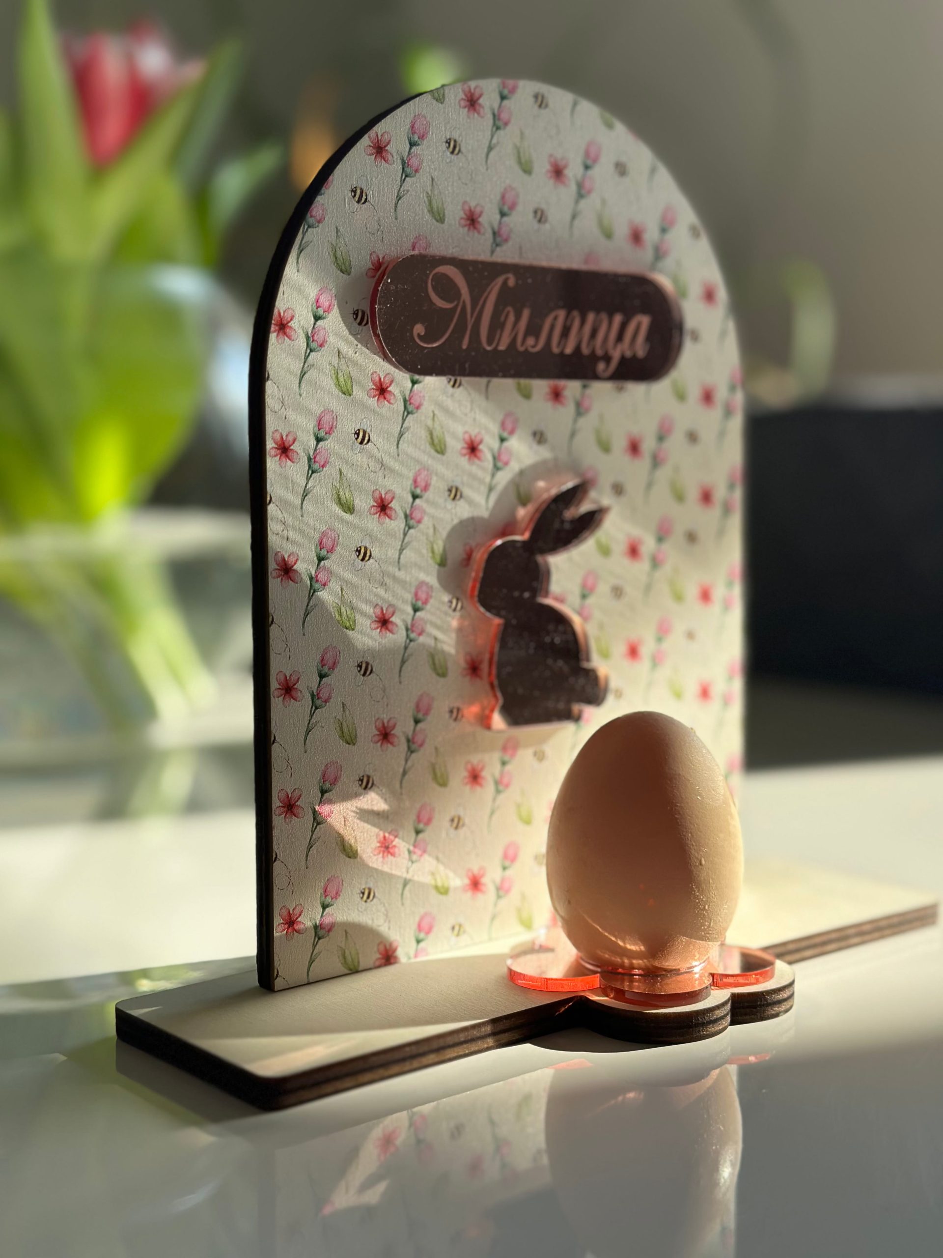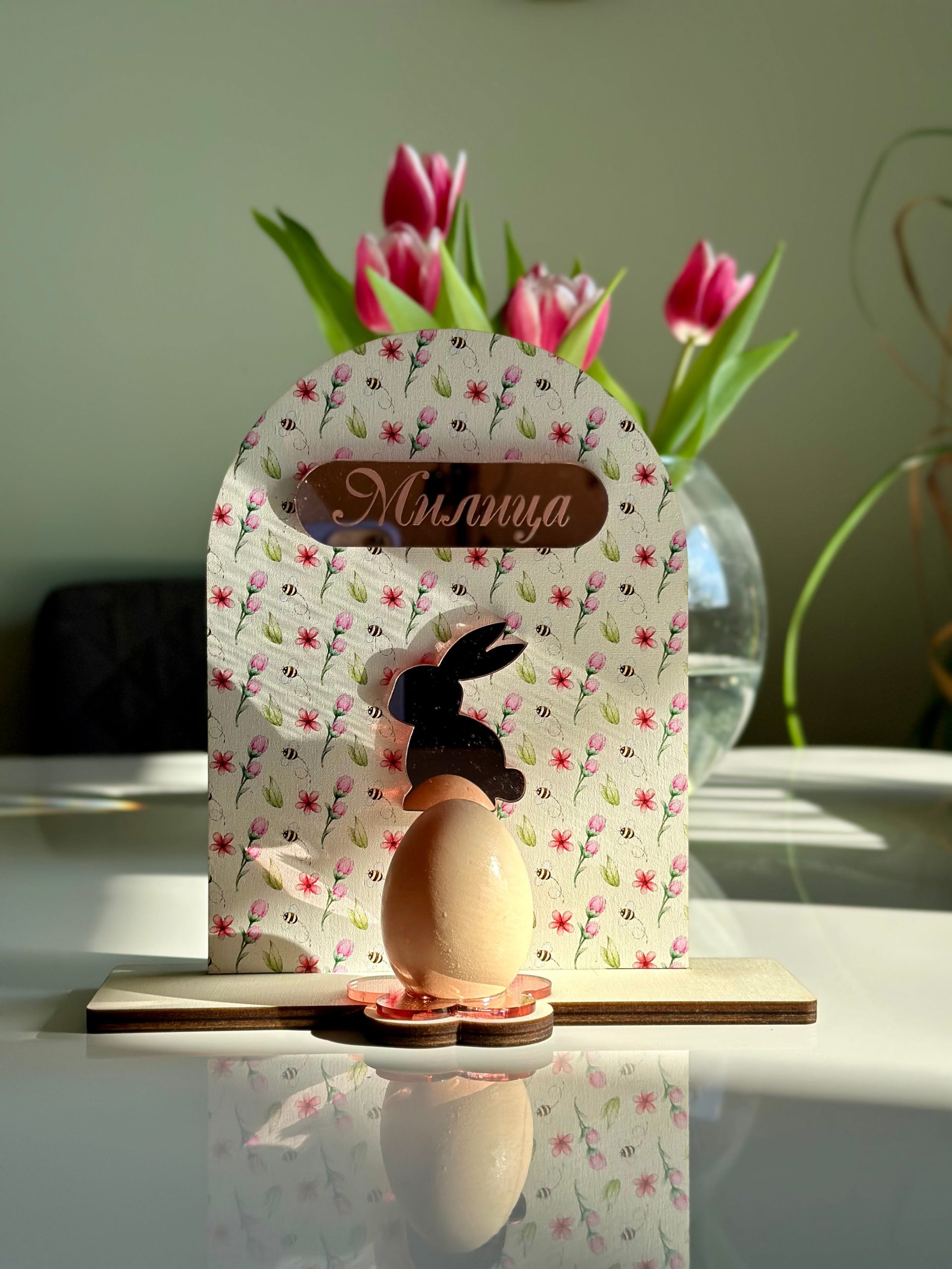 Stalak za jaje od drveta sa štampom i imenom ili prezimenom od rose gold ogledala i zekom.