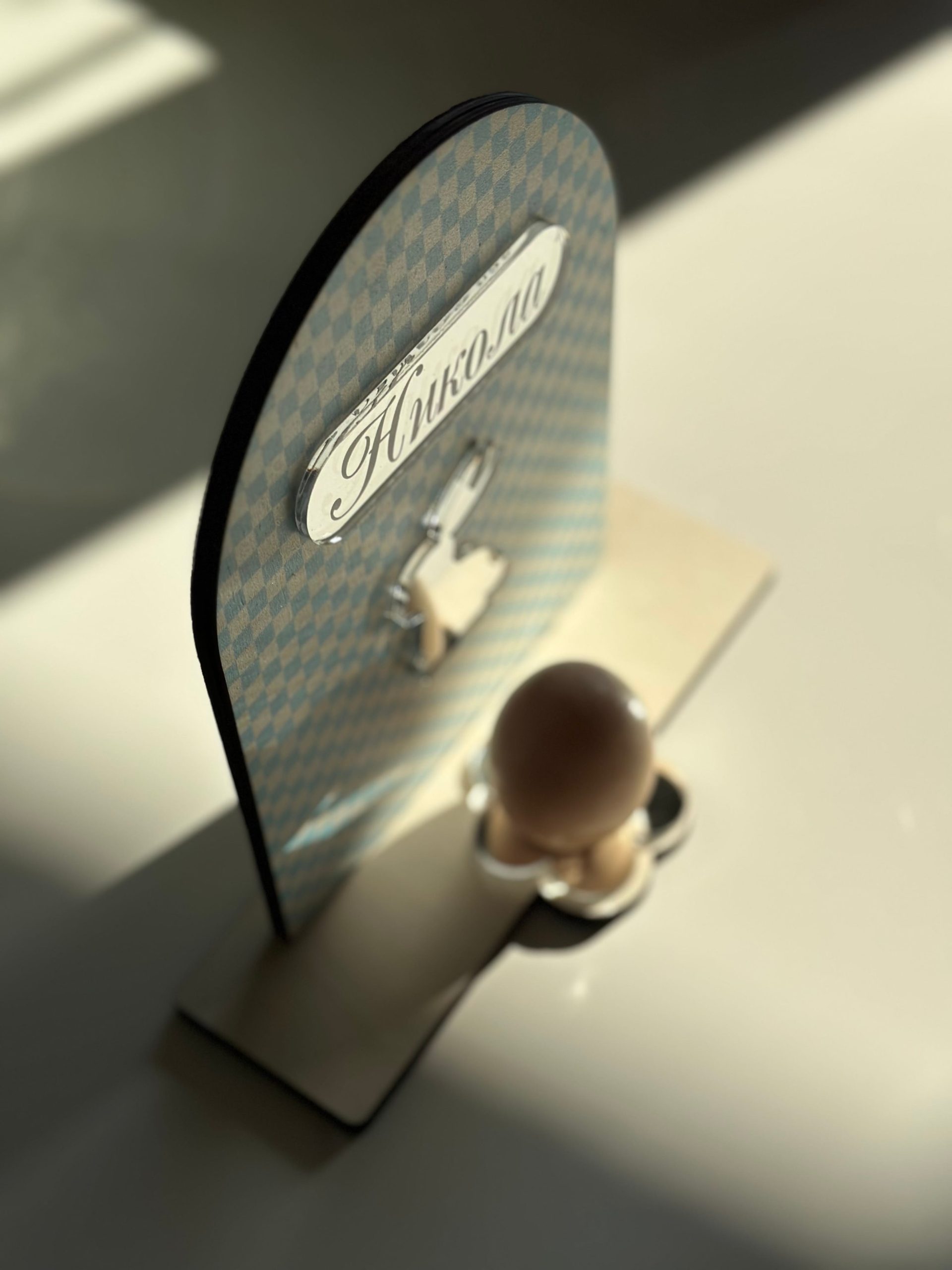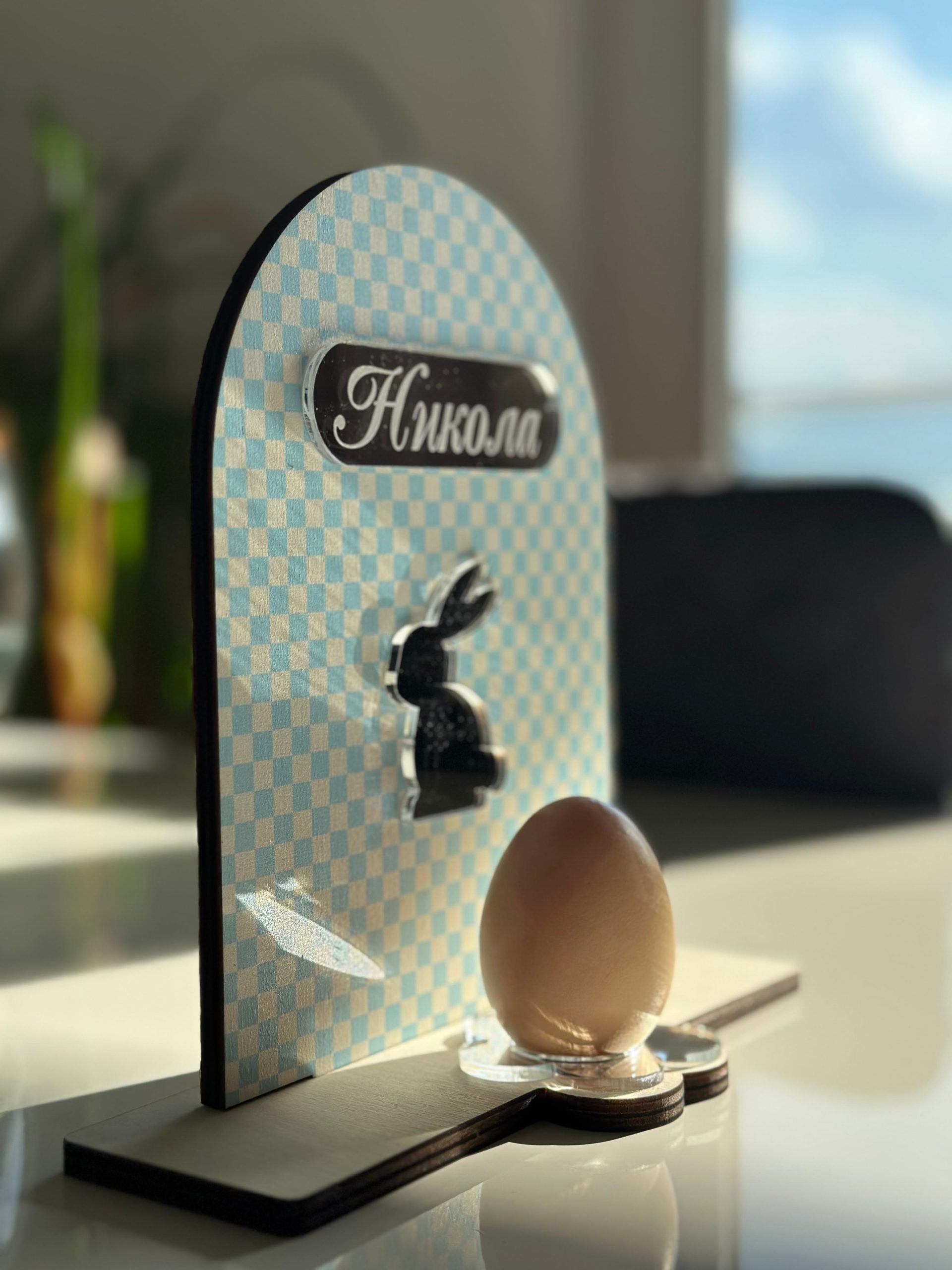 Stalak za jaje od drveta sa štampom i imenom ili prezimenom od srebrnog ogledala i zekom.
